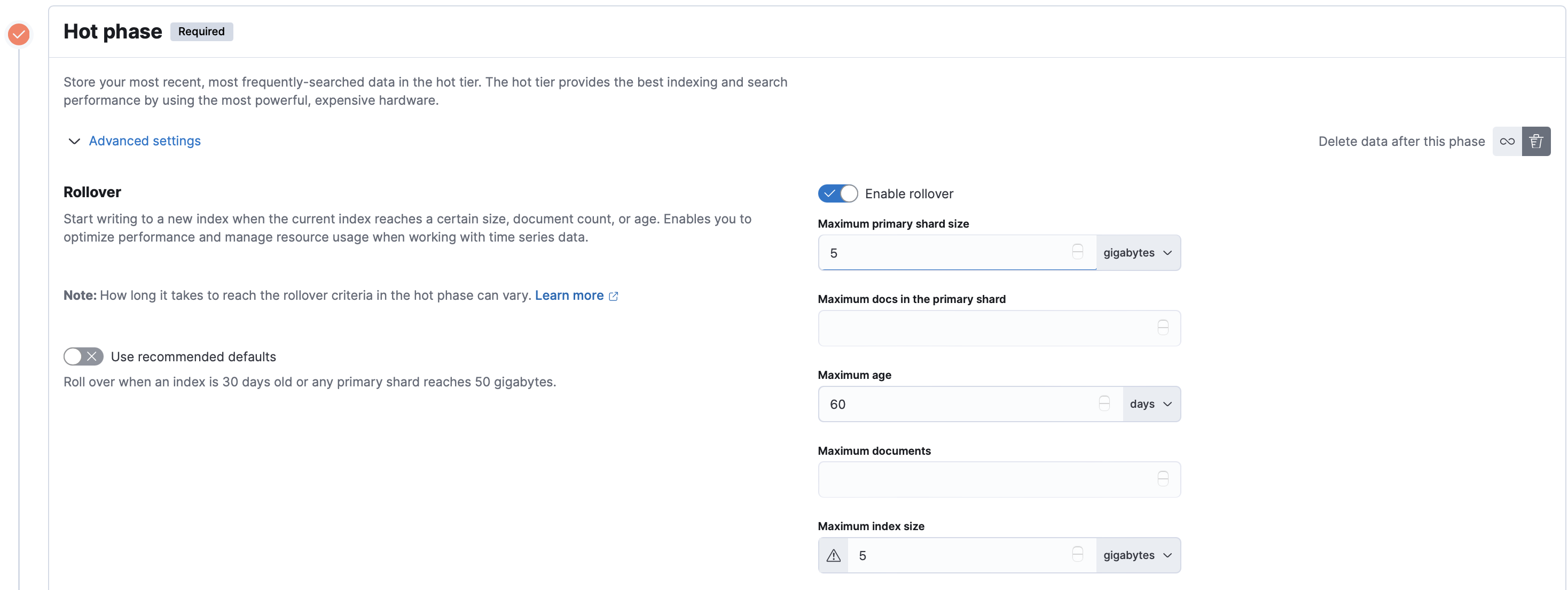 Hot • Warm • Cold 3단계로 나누어져 있는데 여기서는 Hot phase만 사용할 것입니다. 더 복잡한 설정이 필요하다면 추가 검색을 추천드립니다.